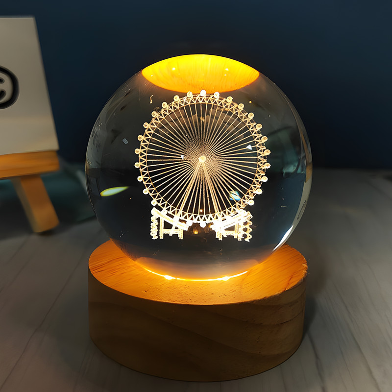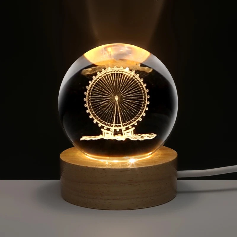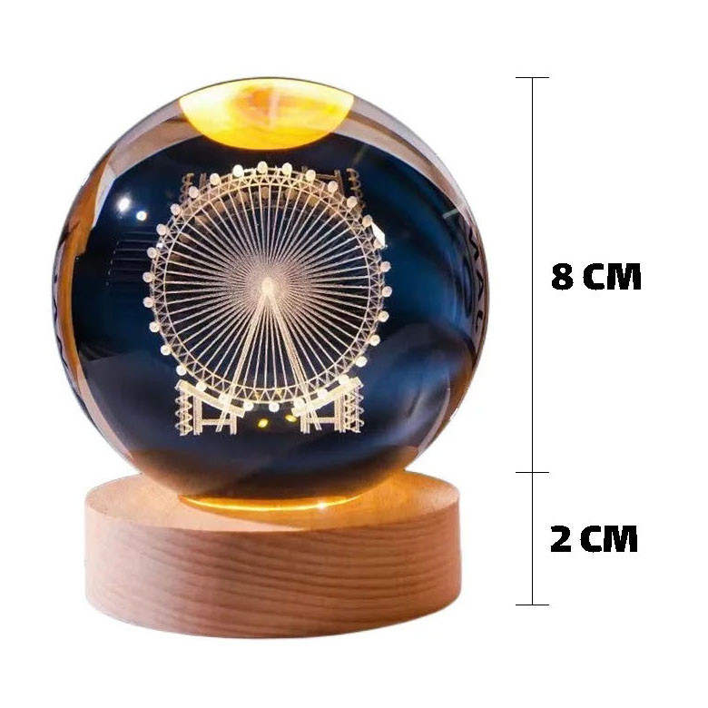 چراغ خواب گوی کریستالی میتواند یک هدیه بسیار زیبا به کودکان و حتی بزرگسالان باشد. پایه ی چوبی زیر گوی از طریق کابل مربوطه به برق متصل می گردد و سپس LED های روشنایی که داخل پایه ی چوبی طراحی شده اند, روشنایی دل انگیزی به گوی می دهند طوری که طرح داخل گوی به زیبایی می درخشد و نور بر روی سقف اتاق می تابد . این محصول یکی ا سانتی متر میز جدید ترین محصولات دکوراسیون داخلی می باشد . طرح این گوی کریستالی به صورت چرخ و فلک می باشد که اگر به USB وصل شود یک چرخ و فلک بسیار زیبا نمایان می شود . این گوی دارای قطر 6 سانتی متر می باشد.